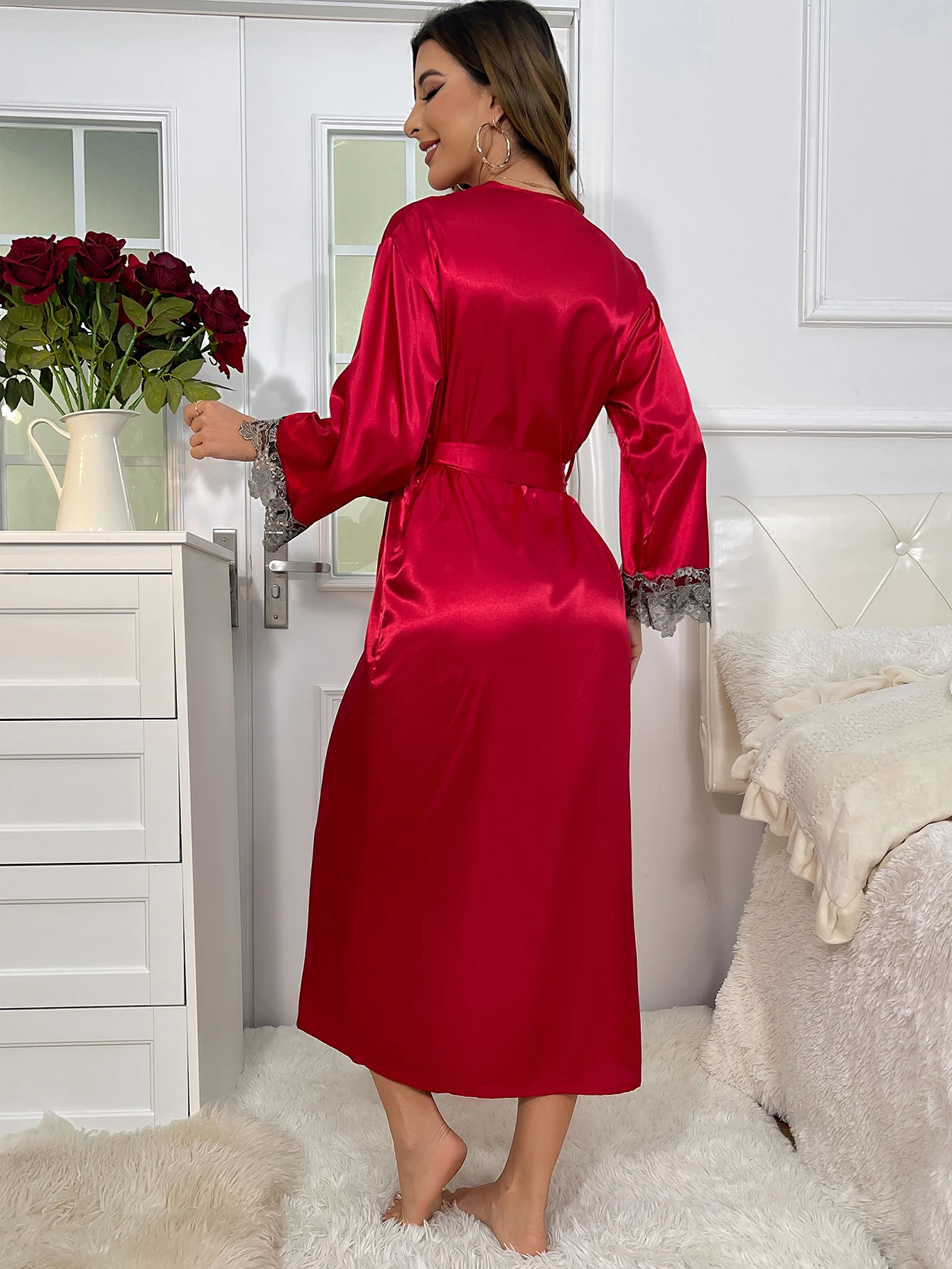 Women'S Luxury Lace Red Pajama Set 2 Piece Long Robe and Nightdress Bridal or Dating Homewear
